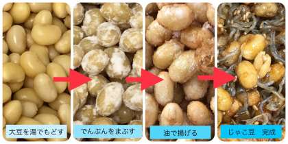 じゃこ豆は、熱湯にひたした大豆を、水気を切りでんぷんをまぶして、熱した油で揚げます。揚げた大豆とちりめんじゃこ・いりごま・調味料を混ぜ合わせ、じゃこ豆の完成です。甘辛い味付けでかみごたえのある、児童に人気の献立です。
