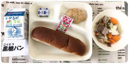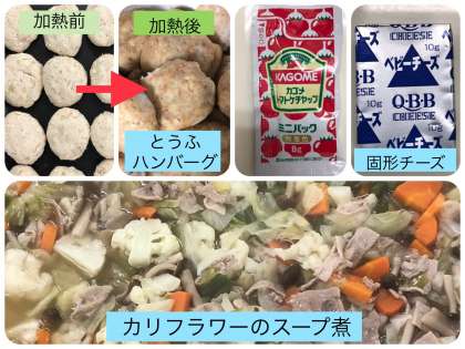 今日の献立は、とうふハンバーグ・カリフラワーのスープ煮・固形チーズ・黒糖パン・牛乳でした。