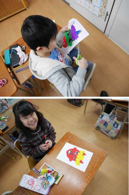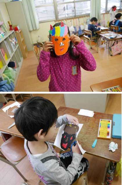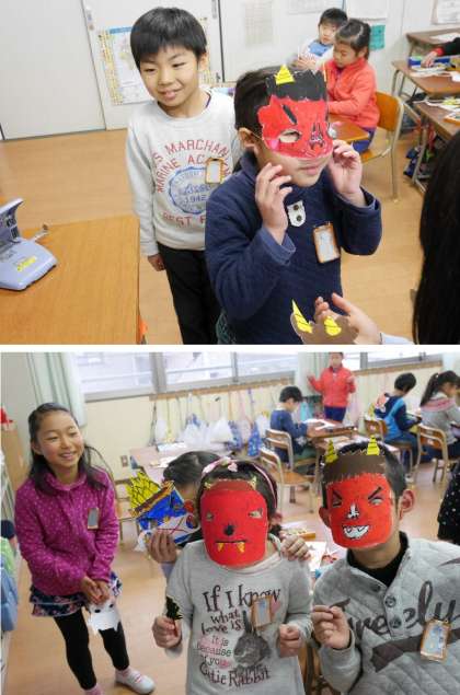今日は節分です。2年生のクラスでは鬼の面をつくっていました。いろいろな色の鬼がいますね。赤鬼、黒鬼、黄鬼・・・・マスクをしている鬼もいてるよ。風邪がはやっているかね。気をつけよう!