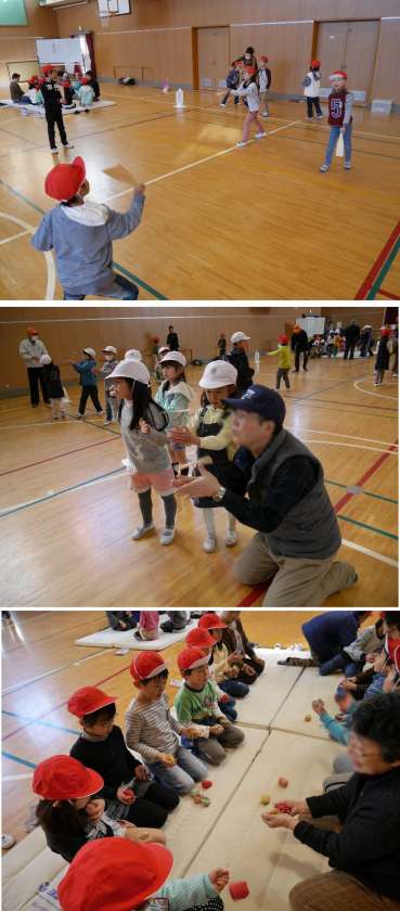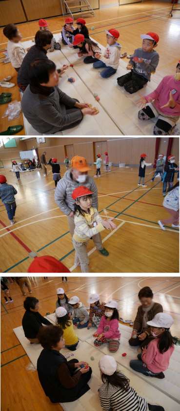 1年生のむかし遊びは体育館でおこないました。地域のかたがたがやさしく教えてくれました。「お手玉」「はごいた」「竹とんぼ」「コマ回し」と順番に遊びました。とても楽しかったですね。地域の方が帰られるときには、みんなでお礼を言いました。