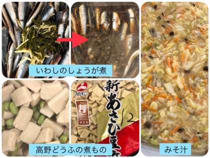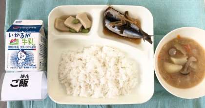 今日の献立は、いわしのしょうが煮・みそ汁・高野どうふの煮もの・ごはん・牛乳でした。