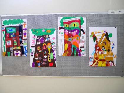 2年生の掲示板に作品がはられています。よくできていますね。大きな木に自分の家があるんですね。