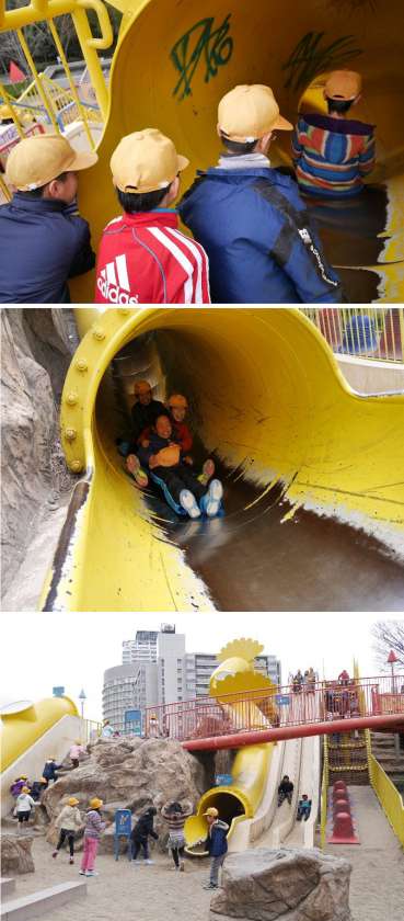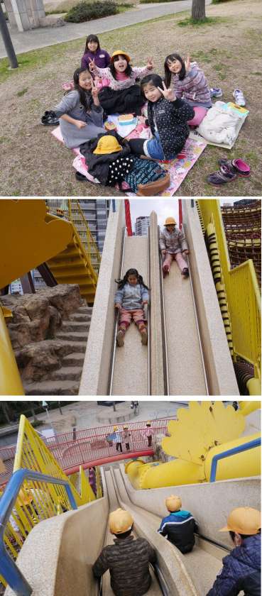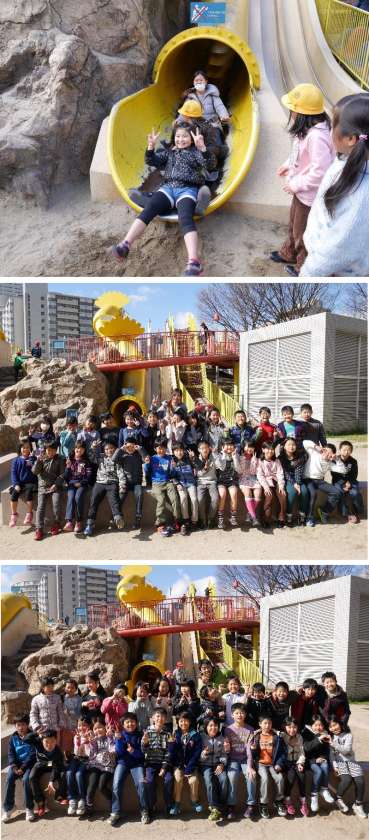 お弁当のあとは、扇町公園の大きな滑り台で遊びました。寒さも忘れて、汗をかきながら、とても楽しそうにあそんでいました。いい笑顔でうれしいです。
