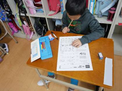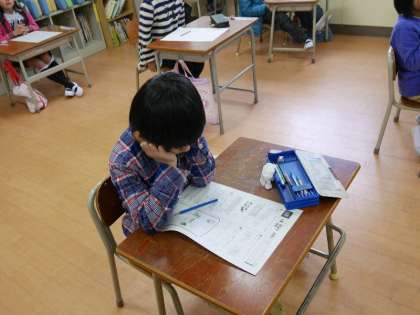 1年生がしんだんテストを受けています。算数の問題に頭をかかえて考え込んでいる子もいます。がんばってね。