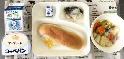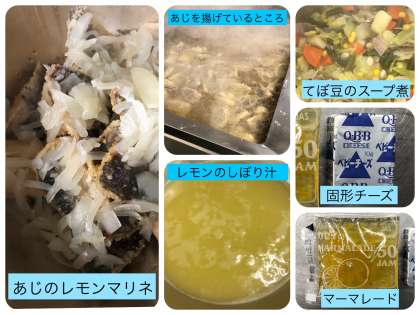 今日の献立は、あじのレモンマリネ・てぼ豆のスープ煮・固形チーズ・コッペパン・マーマレード・牛乳でした。