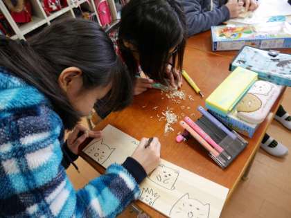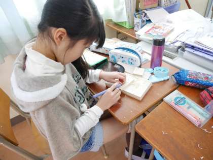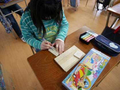 6年生の作品づくりはテープカッターです。木製の板を彫刻しています。できあがったら家で使えるね。