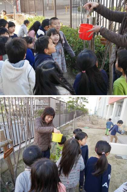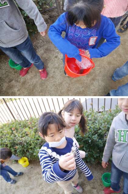 1年生がバケツに水を入れて外においてあると氷ができていました。1年生が観察しているところです。