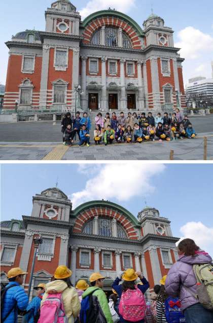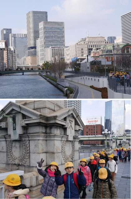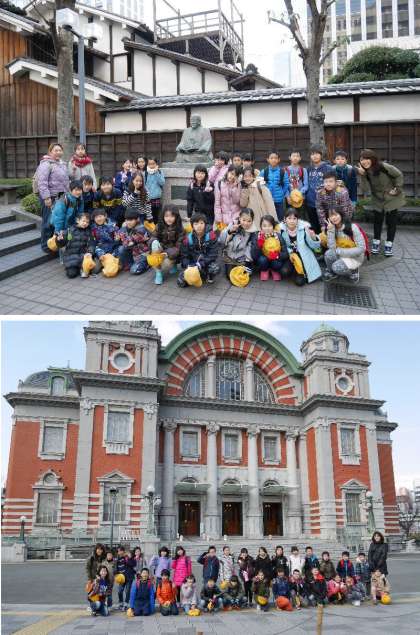 適塾をでて、近くにある中央公会堂にいきました。市役所のうらにあります。学級写真を記念に撮影しました。橋には大阪市の「みおつくし」がありました。
