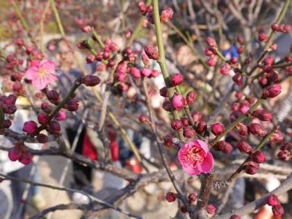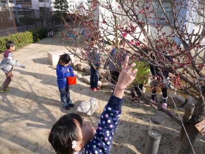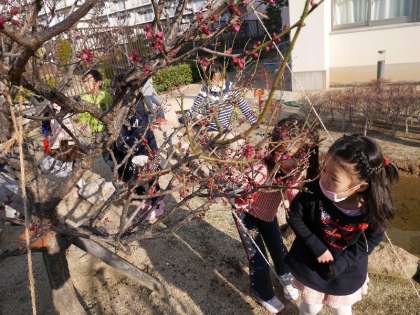 校舎うらにある梅の花が咲きました。1年生が観察しています。「春はもうすぐきてるね」とうれしそうに話してくれました。
