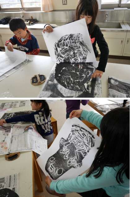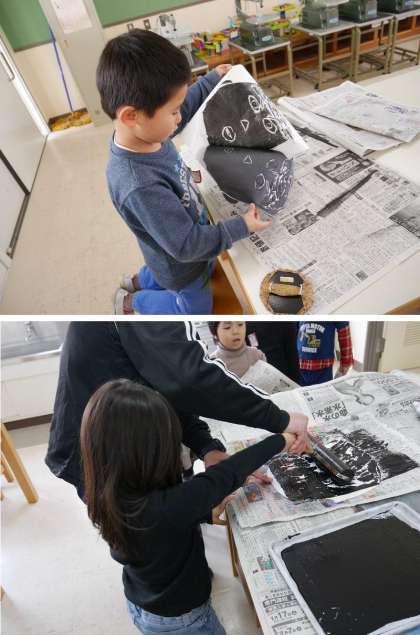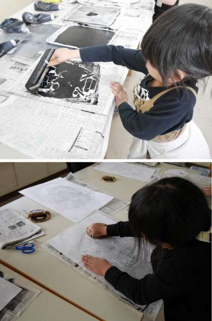1年生は画用紙を重ねてはる版画をしています。インクをローラでぬって、用紙にかさねて、バレンでこすっています。ゆっくりはがすと自画像があらわれてきました。なかなか迫力ある絵になりましたね。