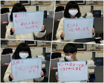 いくつかのヒントをもらいながら、今はやりのどのアニメなのかを答えます。