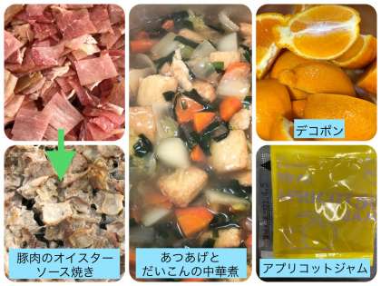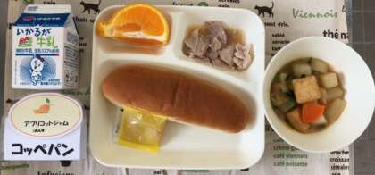 今日の献立は、豚肉のオイスターソース焼き・あつあげとだいこんの中華煮・デコポン・コッペパン・アプリコットジャム・牛乳でした。