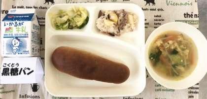 今日の献立は、中華おこわ・卵スープ・キャベツとピーマンのいためもの・黒糖パン・牛乳でした