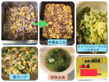 「卵スープ」は、鶏卵の『除去食対応献立』です。鶏肉・にんじん・もやし・チンゲンサイ・調味料を加えて卵除去食の分を取り、最後に液卵を流し入れます。誤配のないように、ピンク色の食器に配食し、個票をつけて提供します。