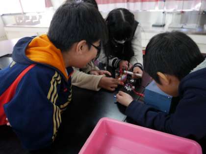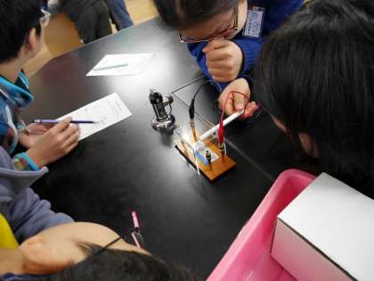 6年生の理科で実験をしていました。「電熱線の太さと発熱」について学習しています。電熱線に電気を通して、発砲ポリスチレンが切れるかの実験です。実験ではいつも結果を予想して考えます。予想と結果がどうなるのかで考察を考えます。