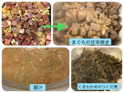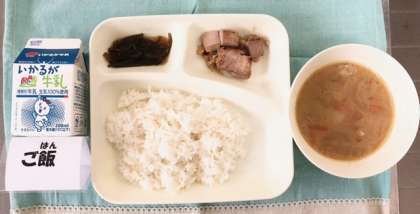 今日の献立は、まぐろの甘辛焼き・豚汁・くきわかめのつくだ煮・ごはん・牛乳でした。
