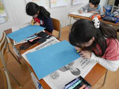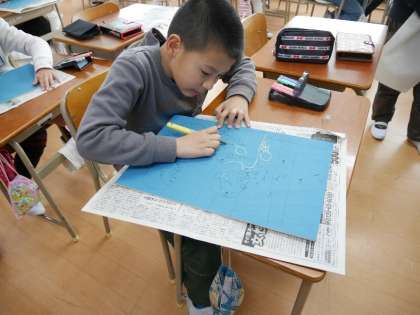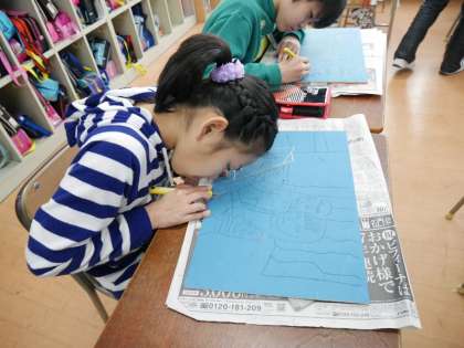 5年生の図工は版画です。音楽発表会の絵を描いて版画にします。下絵を版木にうつして掘り始めました。刷り上がりが楽しみですね。