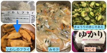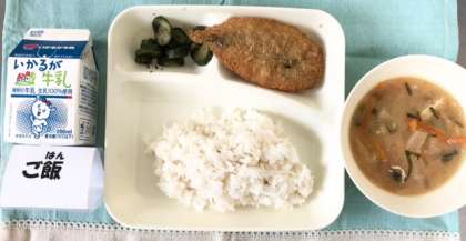 今日の献立は、いわしのフライ・みそ汁・きゅうりの赤じそあえ・ごはん・牛乳でした。