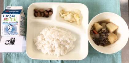 今日の献立は、肉じゃが・はくさいのゆず風味・とら豆の煮もの・ごはん・牛乳でした。