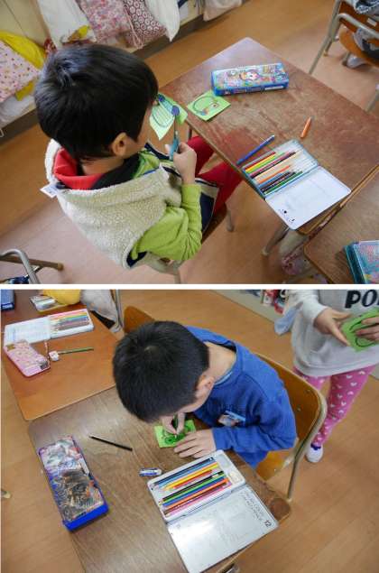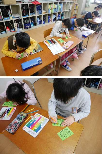 2年生が、卒業する6年生へのメッセージカードを書いています。たてわり班でいつもおせわになっているリーダへのカードです。3月の卒業お祝いの会のときに手渡す予定です。