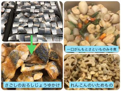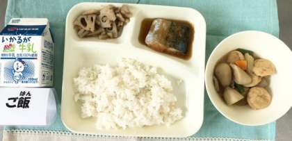 今日の献立は、さごしのおろしじょうゆかけ・一口がんもとさといものみそ煮・れんこんのいためもの・ごはん・牛乳でした。