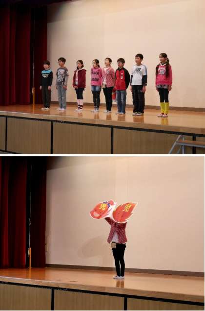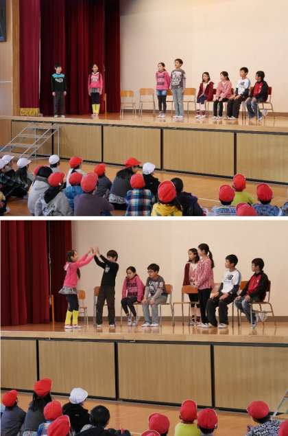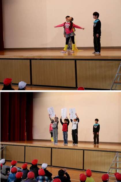 今日の児童朝会は、運営委員会の発表でした。「やきお」と「やきこ」が登場して、運営委員会のいろいろな活動を劇で紹介してくれました。笑いありクイズありの楽しい発表でした。