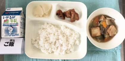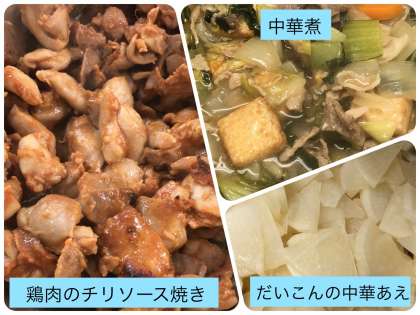 今日の献立は、鶏肉のチリソース焼き・中華煮・だいこんの中華あえ・ごはん・牛乳でした。