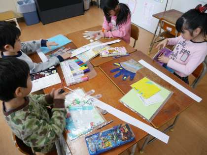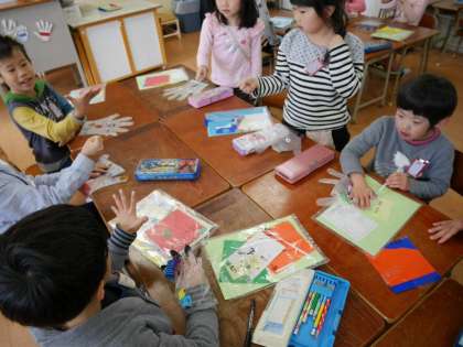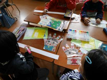1年生がビニール手袋に絵を描いています。空気を吹き込むとニョキニョキとでてきますよ。