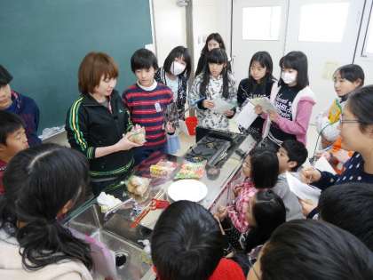 6年生が家庭科の調理実習で、ジャーマンポテトをつくるようです。必要な道具や食材、手順を確認しています。できたら味見させてくださいね。