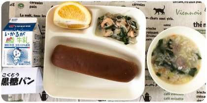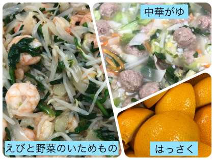 今日の献立は、えびと野菜のいためもの・中華がゆ・はっさく・黒糖パン・牛乳でした。