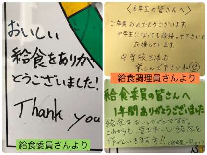 今日は6年生最後の給食でした。給食を取りに来た6年生の当番さんからも「最後の給食いただきます」というあいさつをしていただき、献立黒板には、給食委員さんと調理員さんからの、心温まるメッセージがありました💛