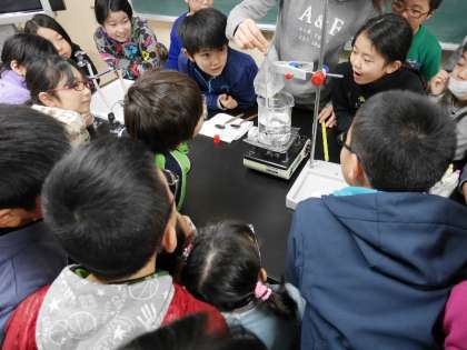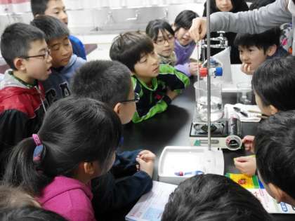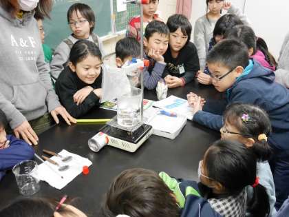 4年生が理科室で実験を見守って観察しています。水をビーカーにいれて温めて沸騰させています。いきおいよく湯気がでてきましたね。それをビニール袋にあつめています。子どもたちは興味深々の顔つきです。勉強っておもしろいね。