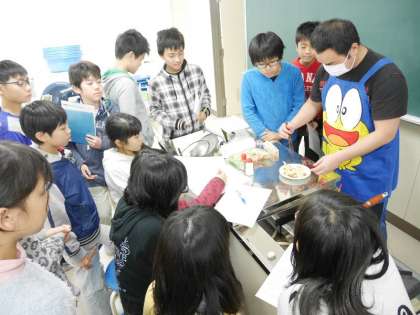 調理実習で6年生はベークドポテトをつくります。チーズがとろりとしてとってもおいしそうですね。先生のうでまえどんなもんだい!次はみんながするんだよ。