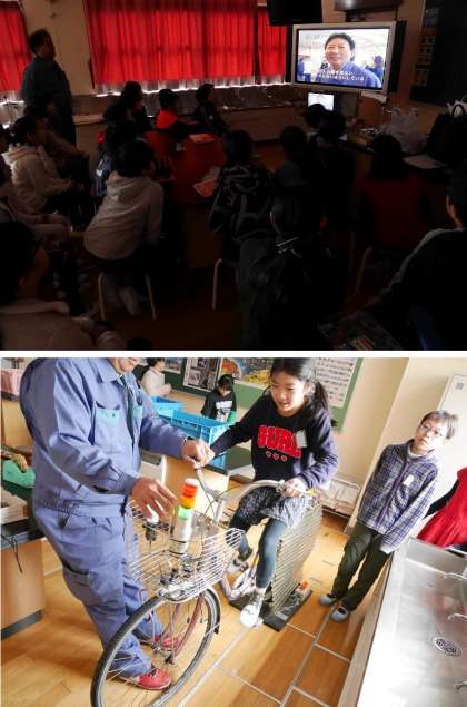 5年生は理科特別授業を2時間うけました。城東区の電機会社の社長さんが出前授業にきてくれました。なんと、人工衛星「まいど1号」の製作にたずさわった会社です。初めにその人工衛星打ち上げのニュースをみました。人工衛星につまれた何十万円もする太陽電池パネルの本物などみせていただきました。また、自転車でLEDをつけたりいろいろな体験をしました。