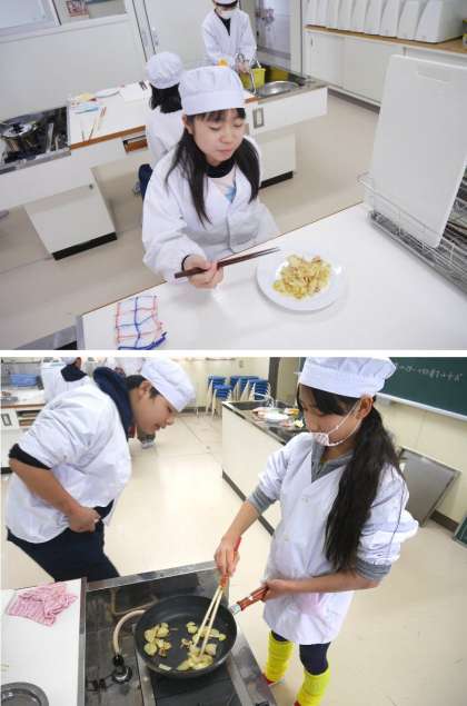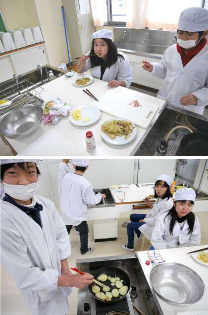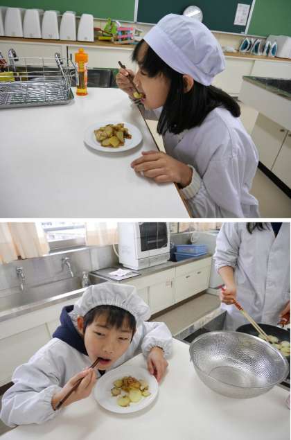 ベイクドポテトの調理実習の本番です。ひとりひとりが自分の分を作ります。チーズのとけぐあいがいいですね。おいしい顔で舌鼓!満足そうな顔ですね。