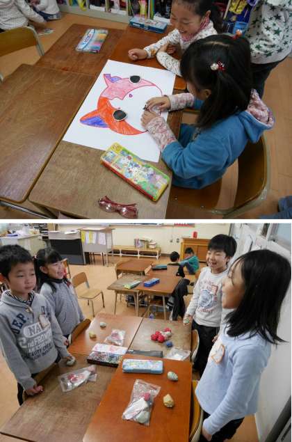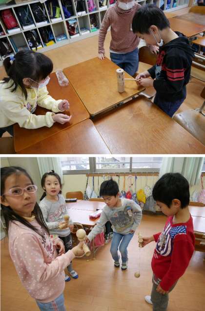 明日は近隣の幼稚園・保育園から、4月に入学してくる新入生が小学校の見学にきます。2年生も一緒にあそんでくれます。ふくわらいやお手玉の説明をして遊ぶ練習をしています。たのしみだね。
