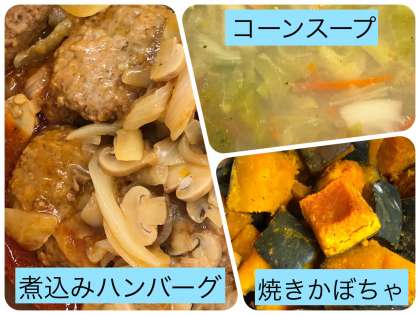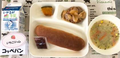 今日の献立は、煮こみハンバーグ・コーンスープ・焼きかぼちゃ・コッペパン・いちごジャム・牛乳でした。