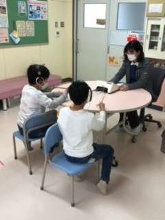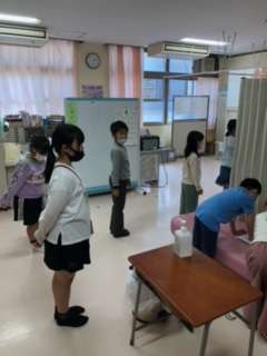 順番を待っている児童は、互いに注意し合いながらソーシャルディスタンスを保っていました。