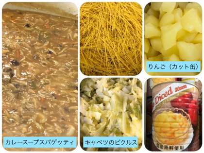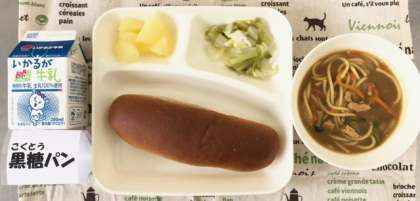 今日の献立は、カレースープスパゲッティ・キャベツのピクルス・りんご(カット缶)・黒糖パン・牛乳でした。