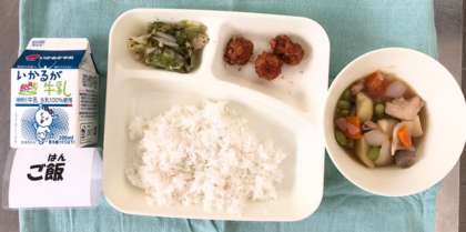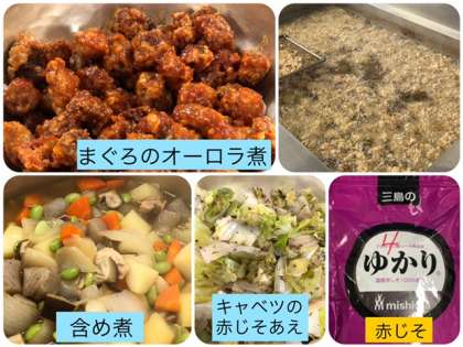 今日の献立は、まぐろのオーロラ煮・含め煮・キャベツの赤じそあえ・ごはん・牛乳でした。
