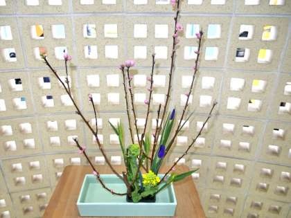 いつも地域の方にいけていただいている玄関のいけばなです。今月は梅の花、菜の花やチューリップがいけられています。春がもうそこまで来ていますね。