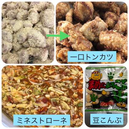 今日の献立は、一口トンカツ・ミネストローネ・豆こんぶ・黒糖パン・牛乳でした。