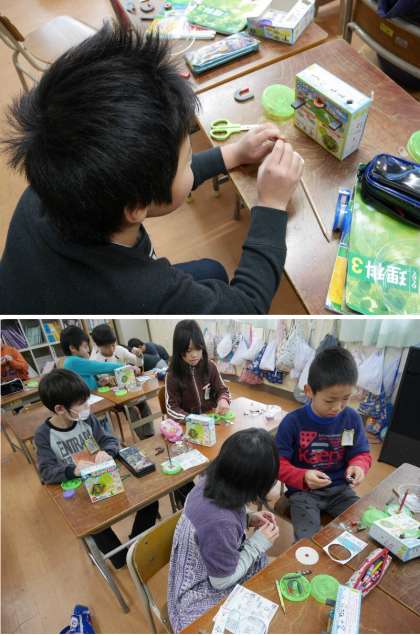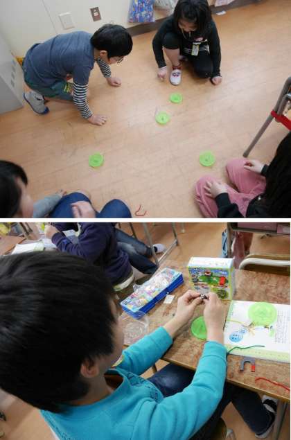 3年生が磁石をつかっていろいろなことにチャレンジしています。ベースボールゲームでは、磁石を反発でとばしてヒットやホームランにとばして磁石につくといいんですね。楽しんでいますね。しっかりと体験して学習してください。