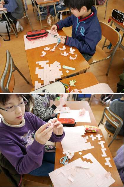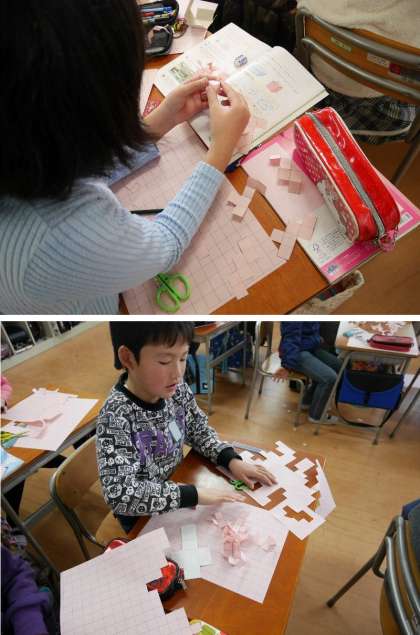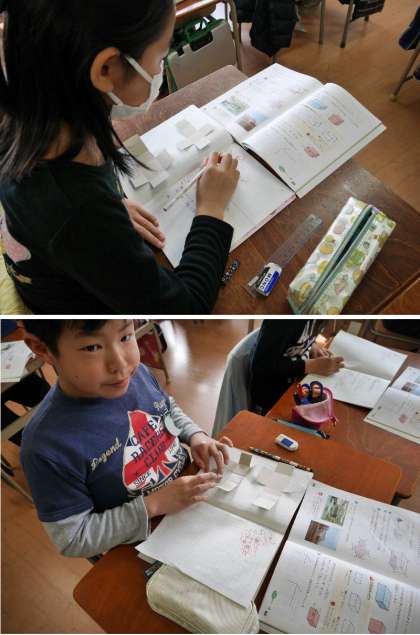 4年生では立方体の学習をしています。展開図にすると11種類もあるのですが、うまくきりとらないと立法体ができませなね。考えて一生懸命に切っています。