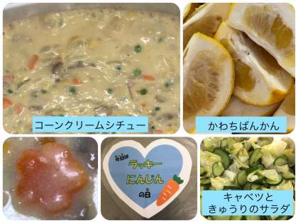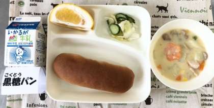 今日の献立は、コーンクリームシチュー・キャベツときゅうりのサラダ・かわちばんかん・黒糖パン・牛乳でした。