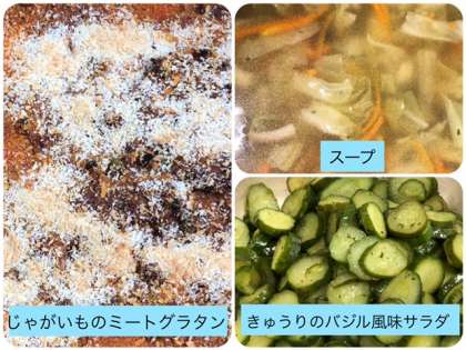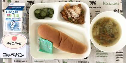 今日の献立は、じゃがいものミートグラタン・スープ・きゅうりのバジル風味サラダ・コッペパン・りんごジャム・牛乳でした。