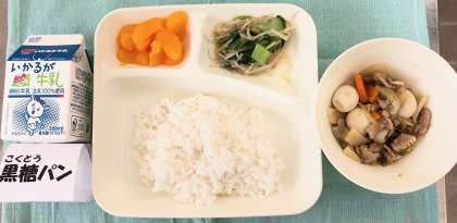 八宝菜の「八宝」とは、八種類ではなく「たくさんの材料を集めて作った」という意味です。豚肉・うずら卵・たまねぎ・キャベツ・にんじん・たけのこ・ピーマン・しいたけを使い、とろみをつけて仕上げます。この献立は、うずら卵の除去食対応献立です。除去食は誤配・誤食防止のため、ピンク色の食器を使用し、個票を付けて手渡ししています。