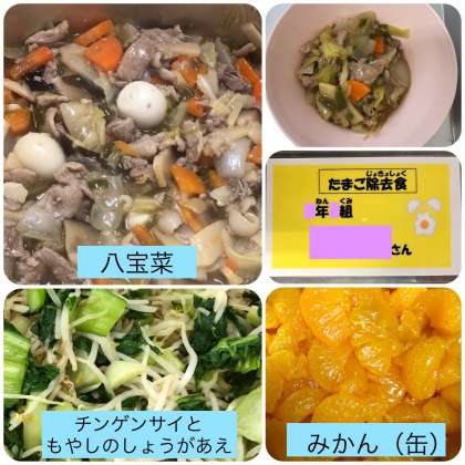 今日の献立は、八宝菜・チンゲンサイともやしのしょうがあえ・みかん(缶)・ごはん・牛乳でした。