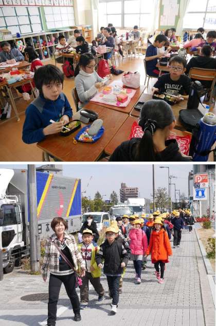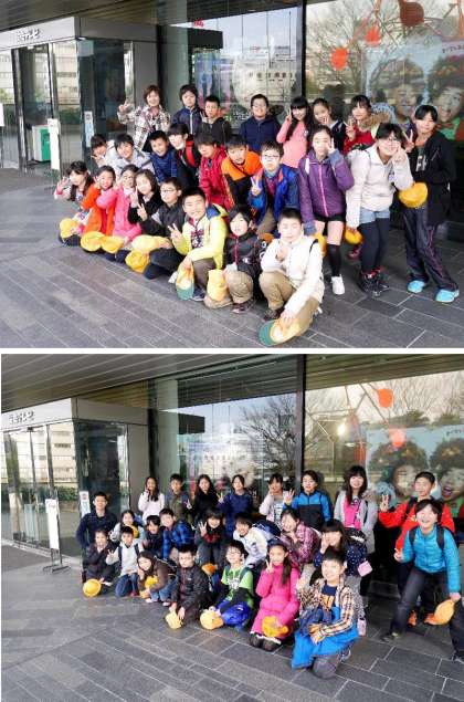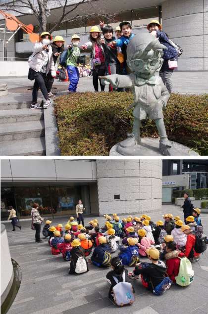 5年生の社会見学は京橋にある読売テレビにいきました。学校で早めにお弁当を食べて出発しました。テレビ局まえで記念写真を撮りました。コナンの銅像もありました。