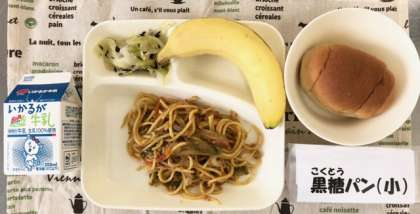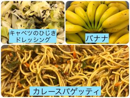 今日の献立は、カレースパゲッティ・キャベツのひじきドレッシング・バナナ・黒糖パン(1/2)・牛乳でした。